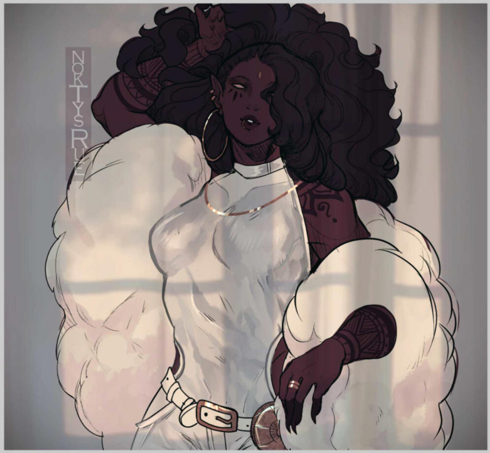 She’ll almost always wear white, excluding times during her and her wife’s lonesome. The fluffy boa is essential, she must look stylish if willing to win hearts after all, adding to this, symbolizes the fur she grows no different to a mane in transformation. She wears the golden jewelry and a raven cane bought from Mako’s money, to pour salt on his dead wounds.